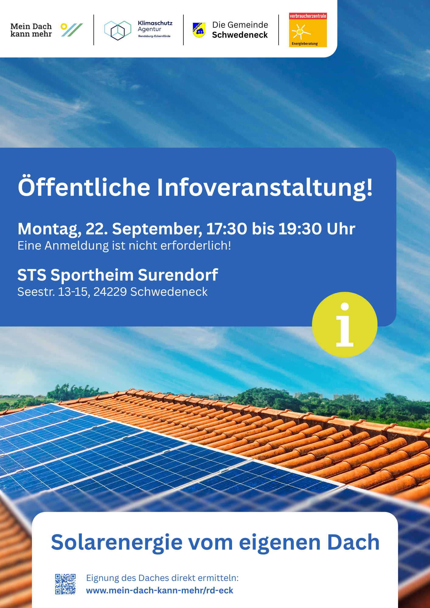 In Zeiten der Energiewende wird eine autarke Energieversorgung für viele Menschen immer wichtiger, immer häufiger sind Solaranlagen auf den Dächern von Ein- und Mehrfamilienhäusern auch in Schleswig-Holstein zu sehen. Aber welchen Beitrag für den Klimaschutz leisten diese Anlagen und rechnen sie sich? Welche Dächer sind für Solaranlagen geeignet und welche Anlagenkombination ist die beste? Welche neuen Entwicklungen gibt es in der Photovoltaik und wo kann ich mich über Solaranlagen informieren und beraten lassen? Die Klimaschutzagentur und die Gemeinde Schwedeneck möchten an diesem Abend das Potenzial der Sonne beleuchten und laden alle interessierten Bürgerinnen und Bürger der Gemeinde Schwedeneck herzlich zu diesem kostenlosen Informationsabend ein.